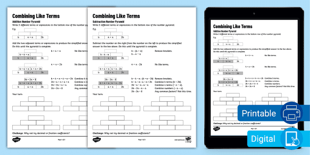 Combining Like Terms Worksheets | Printable Online PDFs - Cuemath Combining like terms is a mathematical process used to simplify an expression or to add or subtract polynomials. These combining like terms worksheets help kids to simplify algebraic expressions. For example, "one pair of twins + one pair of Twins = 2 pairs of twins," or for example, 2x + 3x = (2+3)x = 5x.